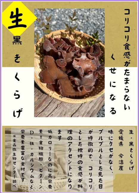 黒きくらげ(アラゲキクラゲ)は、肉厚で弾力のあるコリっとした歯ごたえが特徴のきのこです。